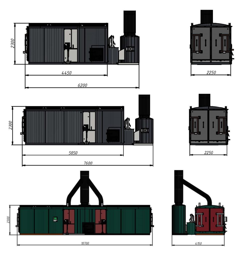 Вуглевипалювальна піч ЕККО випускається у трьох модифікаціях: ЕККО-2, ЕККО-3 та ЕККО-4, основні відмінності полягають у кількості камер для процесу карбонізації (2 або 4). Для моделей ЕККО-3 та ЕККО-4 - це 4 камери карбонізації, для ЕККО-2 - 2 камери відповідно. Моделі ЕККО-3 і ЕККО-4 відрізняються довгою камерою карбонізації і вагонеток відповідноМи використовуємо пару камер, так як карбонізація відбувається у двох різних реакціях - ендотермічної та екзотермічної. Тому ми використовуємо екзотермічну реакцію в одній камері для ендотермічної реакції в іншій. Слід зазначити, що при виробництві деревного вугілля ендотермічна реакція може протікати двічі: на стадії сушіння сировини та первинного піролізу, а також на стадії прокалювання деревного вугілля, якщо потрібний високий вміст вуглецю, що нелетить. Основні переваги печей EKKO – це можливість проводити повний процес карбонізації без додаткового палива та забруднення довкілля.