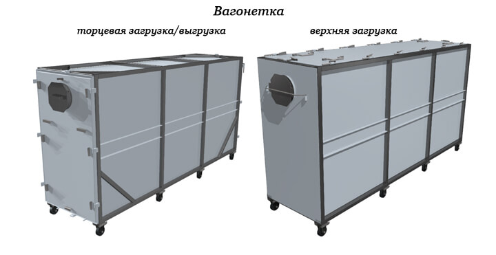 Кількість вагонеток залежить від моделі печі та умов експлуатації, а саме кліматичних умов регіону та вологості сировини. Можливе виготовлення двох типів вагонеток з торцевою або верхньою системою завантаження сировини. Для механізації процесу завантаження зазвичай використовують вагонетки із верхнім завантажувальним люком. Для охолодження деревного вугілля після вивантаження вагонетки з камери використовуються стаціонарні естакади. Вагонетки переміщаються майданчиком з використанням мобільної платформи, завантаження/вивантаження вагонеток в камеру і з камери відбувається з використанням електричної лебідки, що значно спрощує процес виробництва. Крім того, можливе застосування транспортера для вивантаження з них вугілля. У цьому випадку найбільш підходяще застосування буде вагонетка з верхнім завантаженням матеріалів.